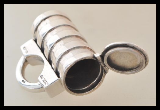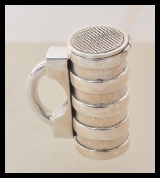 A stamped 925 silver vesta case in the form of a tankard having a hinge lid with striker. Weight 23.7g. Measures 3.5cm high.