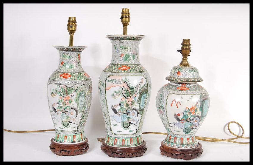 A collection of three 20th Century Chinese table lamps, decorated with panels depicting warriors on horseback bordered by floral decoration. Raised on carved wooden socle pierced bases Highest measures 47 cm.