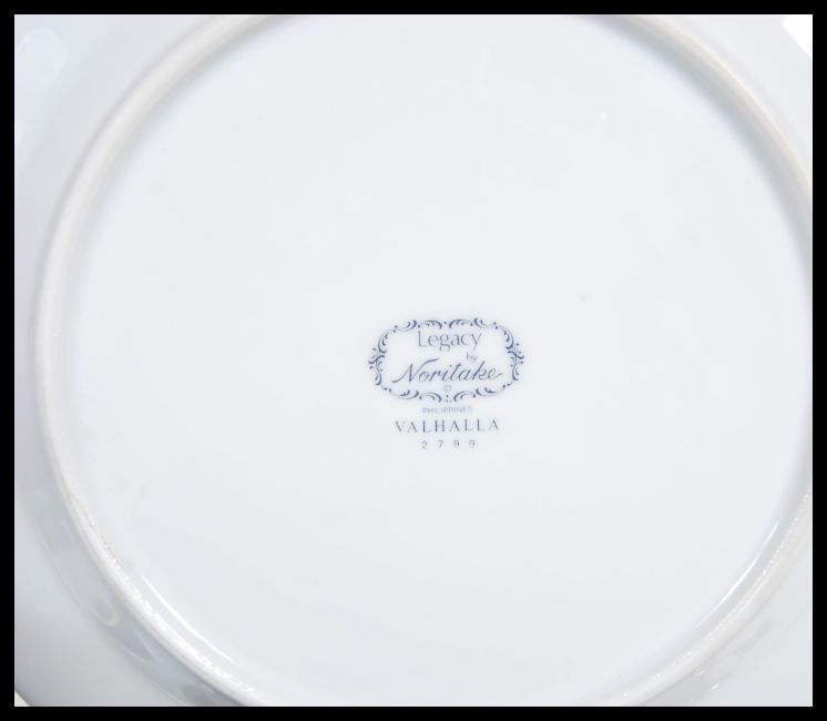 A 20th Century Noritake Legacy tea service in the ' Valhalla ' pattern having banded cobalt blue decoration with gilt detailing, to include cups, saucers, plates etc. Largest measures 42cm width x 32cm deep (meat plate).