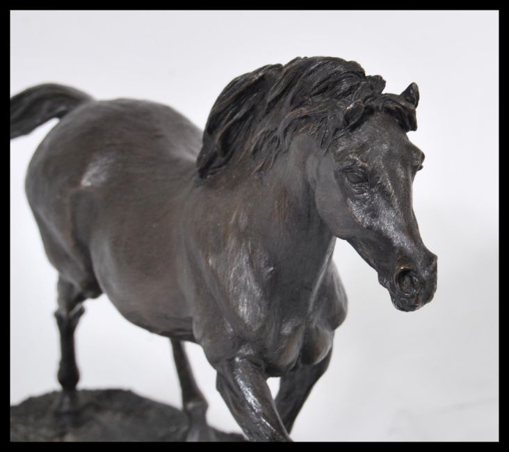A 20th Century contemporary bronzed / bronze effect figurine depicting an Arab horse raised on naturalistic oval plinth base. The horse modelled in a trotting stance with detailed features. Measures 20 cm high x 27 cm wide.