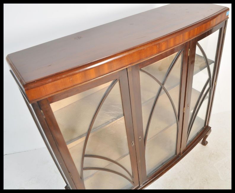 An early 20th Century Queen Anne revival mahogany display cabinet having three astragal glazed doors being raised on claw and ball feet with twin shelves to the interior. Measures 122 cm high x 117 cm wide x 36 cm deep.