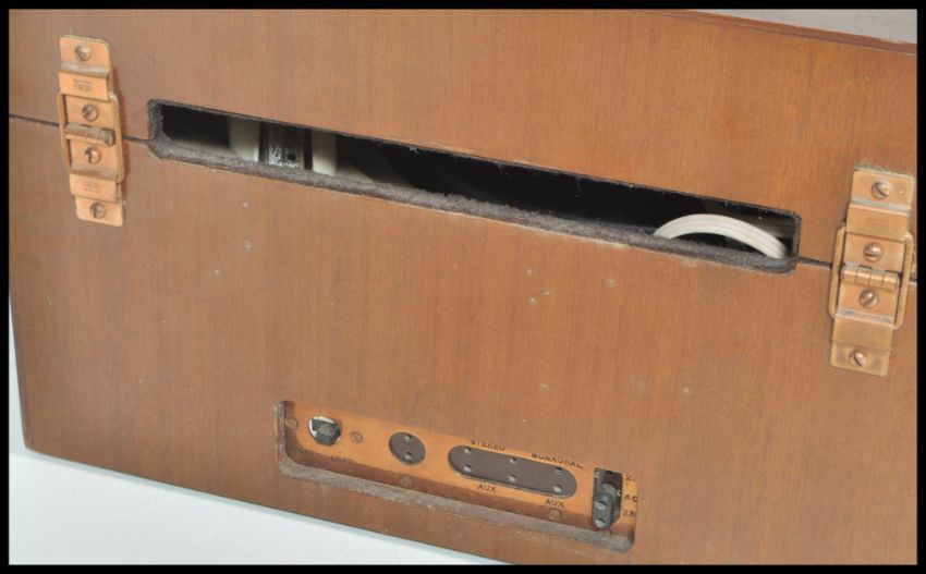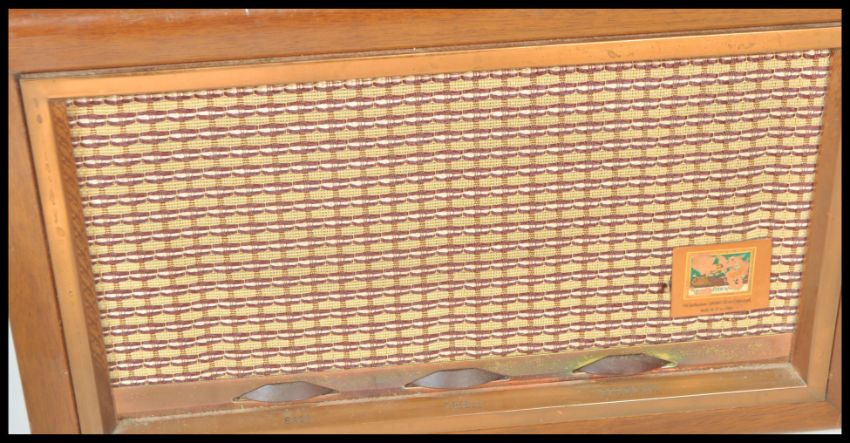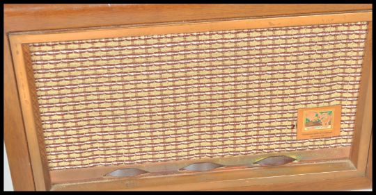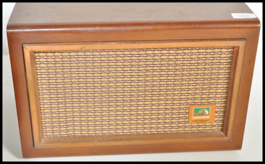 A vintage retro mid 20th Century 1950's HMV His Master's Voice tiger oak cased record player having the original Garrard 209 deck and stylus along with the rarely seen matching amplifier speaker. Both having original grille fronts.