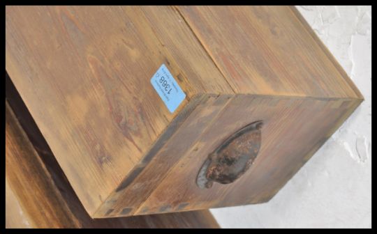 A pair of vintage early 20th Century wooden Lord Roberts ammunition crates having hinged lids with shaped brass handles. Measures 26 cm high x 70 cm wide x 17 cm deep.