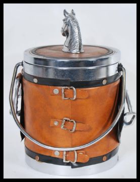 A 20th century novelty equestrian ice bucket having a faux leather finish with a horse finial and stirrups to the side along with a shoe horn having a handle in the form of a dog and a pair of childs Victorian hobnail boots. Measures 54cm long (shoehorn).