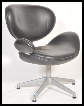 A contemporary Scandinavian 'egg ' design swivel desk chair having a shaped vinyl backrest and shaped padded seat on one armrest in black vinyl and raised on a five point star base. Measures 88 cm high x 77 cm wide x 50 cm deep.