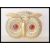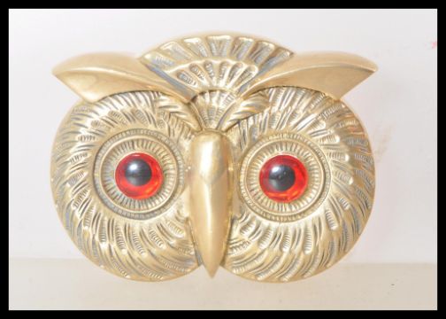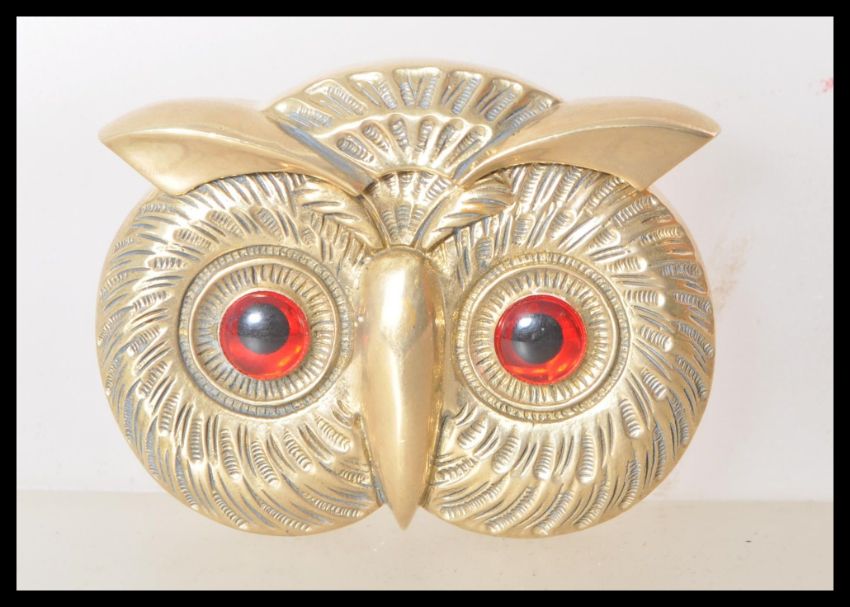 A brass vesta case in the form of an owl having red and black glass eyes, and match striker to the base. Measures 3.5cm H x 5.5cm wide.
