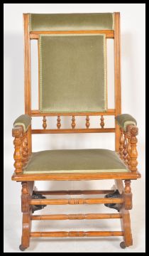 A 19th Century Victorian mahogany aesthetic movement Boston Rocker - American Rocking chair. Raised on sleigh base with sprung rock action, upholstered seat with gallery arms. Measures 111 cm high x 57 cm wide x 65 cm deep.