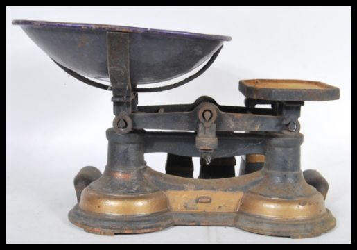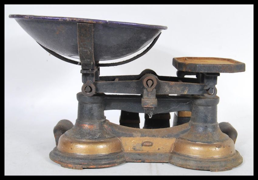 A 19th Century Victorian industrial grocers weighing scales, the balance scales in original ebonised paint with applied gilt detailing, weights ranging from 4lb to 1oz.
