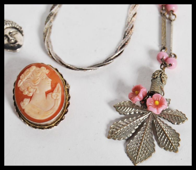 A group of hallmarked silver and sterling silver jewellery to include brooches, cameo, Scottish thistle brooch, moonstone ring, bracelet, sugar tongs, napkin ring etc.