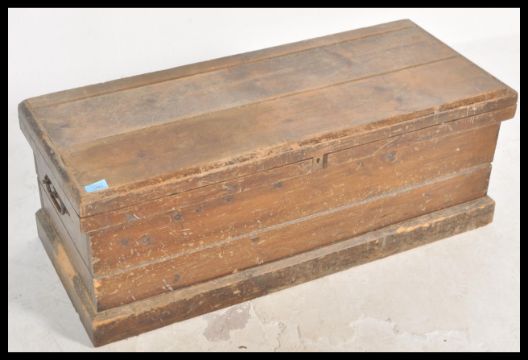 A 19th Century Victorian pine woodworking toolbox  / blanket box chest having a hinged top with side iron swing handles raised upon a plinth base. Measures 35 cm high x 95 cm wide x 39 cm deep.