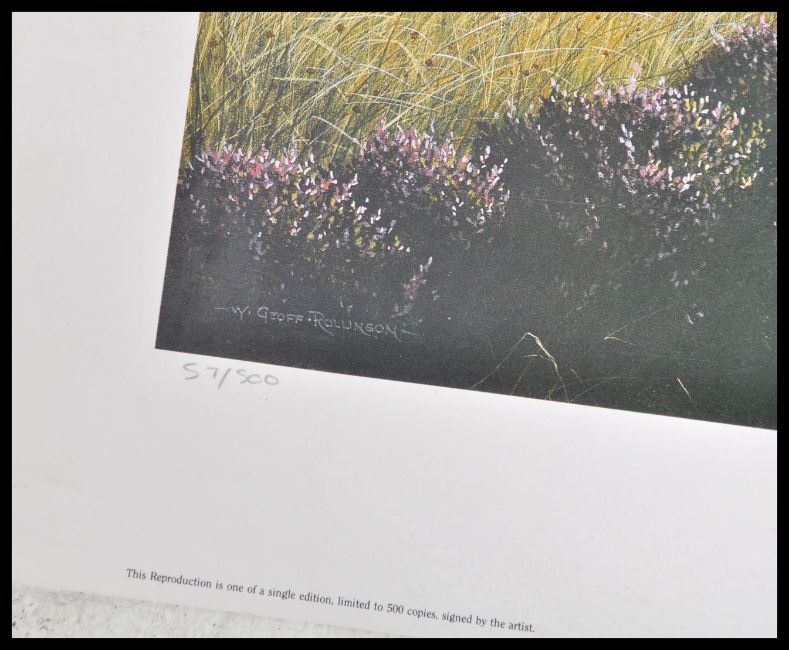 A pair of limited edition prints to include a print after W. Geott Rollinson featuring two golden labradors sitting within a Moore landscape, edition 57/500 signed by the artist to the corner, along with another dog related print after Robert J. May featuring two adult dalmations with two dalmatian puppies. Both unframed.