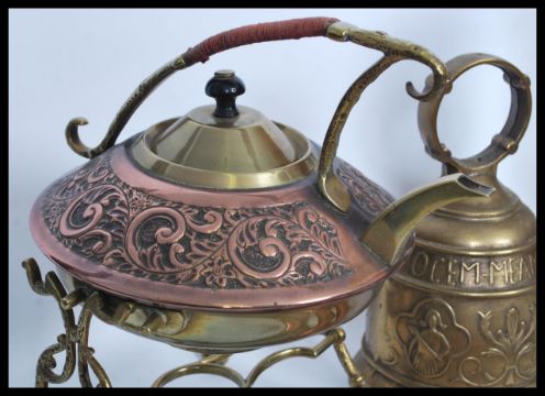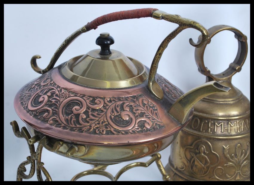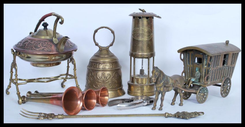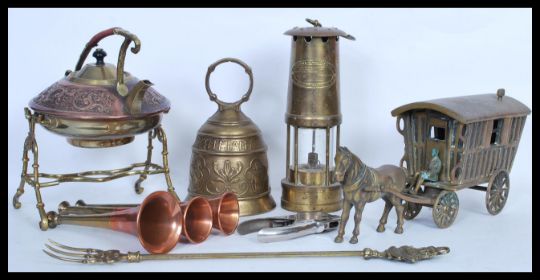 A collection of vintage and antique copper and brass metal wares to include a brass large horse and carriage figurine, copper and brass spirit kettle on stand, miners lamp, bugles, Windsor Castle fire fork etc. Highest measures 26 cm.
