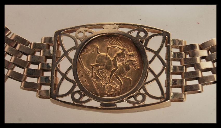 A 9ct gold 375 hallmarked gentleman's bracelet inset with 1909 Edward VII half sovereign coin. Length 19cms long / weight 17.9g total, coin 3.99g / 13.91g strap and padlock. Measures 21cm long.