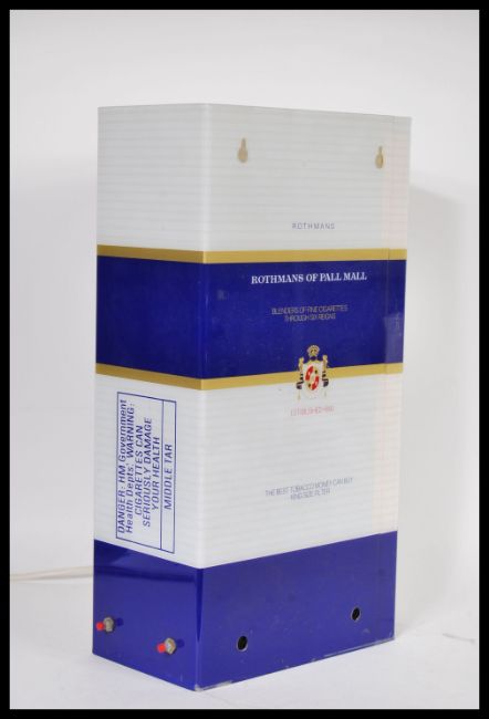 A vintage retro 20th Century Advertising point of sale shop sign Rothmans King Size cigarette lamp in the form of a packet of cigarettes. Measures 41 cm high x 21 cm wide x 12 cm deep.