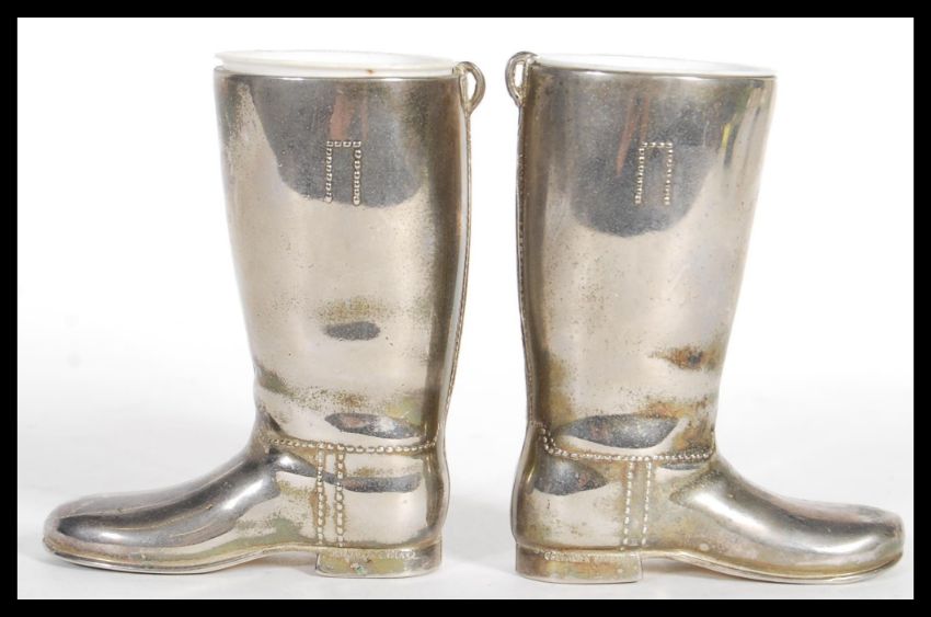 A pair of 20th century silver plated boot measures for spirits. Complete with the white inner linings. Measures 9cm high x 7cm width.