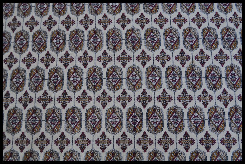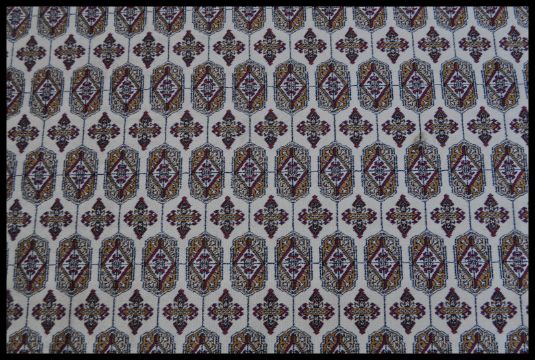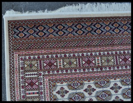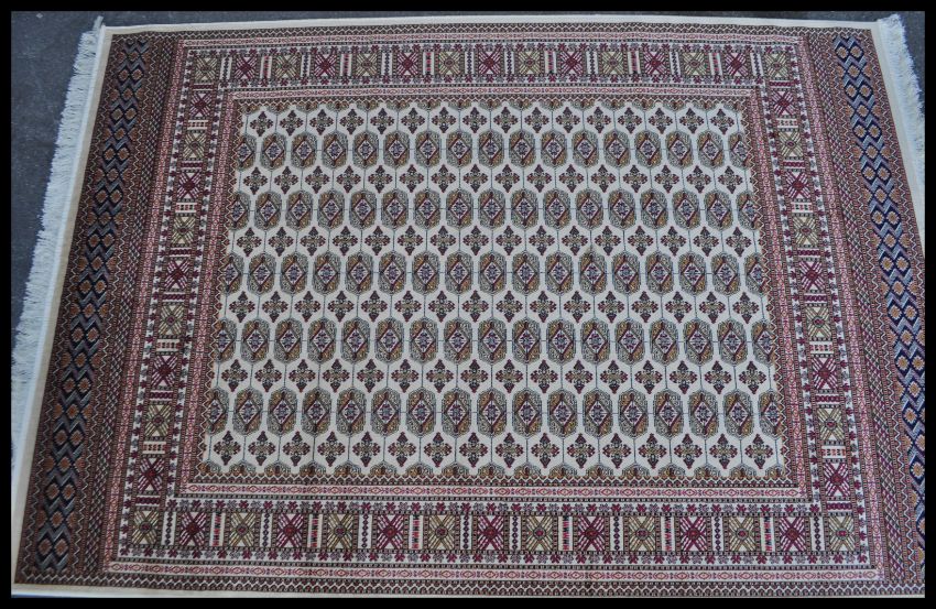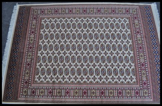 A 20th Century Kejhan Persian Islamic floor carpet rug having a red ground with a central cream medallion and cream border, with floral patterning to the central panel. Measures 280cm W x 200cm D.