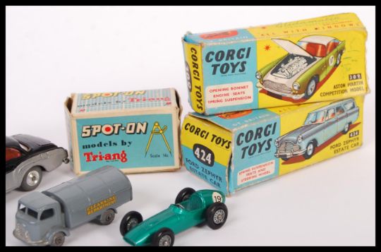 A collection of vintage diecast scale model vehicles to include; Corgi Bentley Continental, 232 Dinky Alfa-Romeo, 222 Corgi Renault Floride, Lesney Refuse Collector, Lesney Aston Martin and a tin plate car along with 3 x empty boxes; Corgi 309, Corgi 424 and Spot-On B.M.W. Isetta No.118.