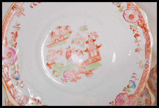 A Victorian 19th Century English Staffordshire tea set consisting of tea cups, saucers, side plates, sandwich/ cake plates, sugar bowl and creamer. Depicting oriental scene with geometric borders and floral sprays throughout.   Measures 24cm diameter (sandwich plate)