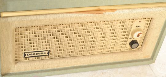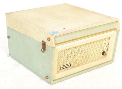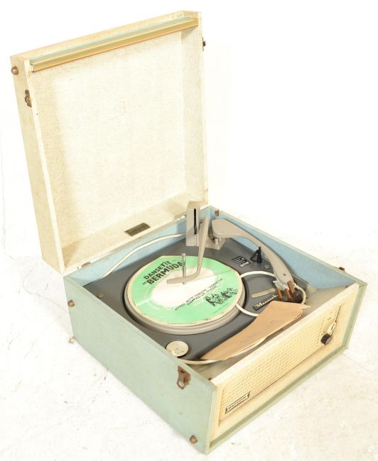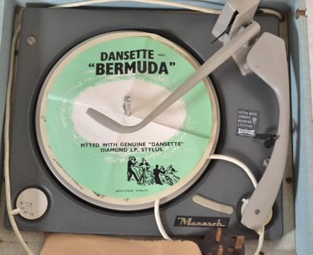 A vintage retro mid 20th century Dansette Bermuda four speed record player having a twin dial Monarch deck set in a two tone case with three dials to front and Dansette badge over hessian style grille.