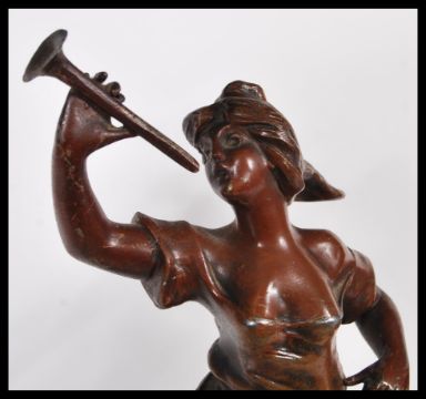 A pair of 20th Century bronzed cast metal figurines in the form of two Grecian style women, one playing a horn and the other holding a bunch of flowers, both raised on faux marble bases with scrolled gilt feet below.