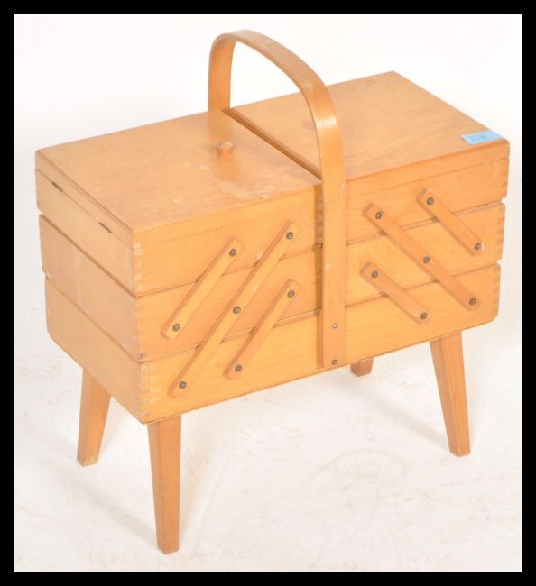 A vintage retro 20th Century teak wood cantilever sewing box having metamorphic action raised on shaped angular legs. Measures 47 cm high x 343 cm wide x 22 cm deep.