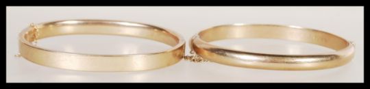 Two vintage hallmarked 9ct gold bangle bracelets one having rounded edges with hidden clasp and safety chain. The other with safety chain and hidden clasp having flat edges. Both having half engraved decoration. Weighs 17.5 grams.