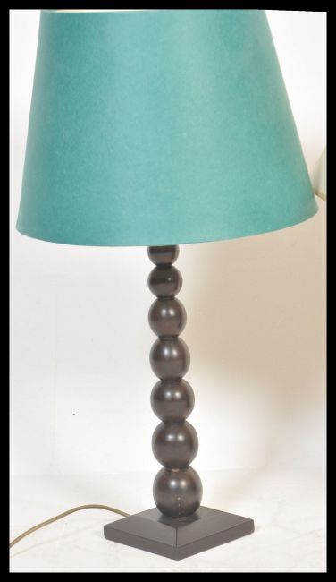 Two vintage retro 20th Century wooden Okra lamps one having a bulbous knopped column and the other of tapering form. Complete with shades. Measures 75cm tall.