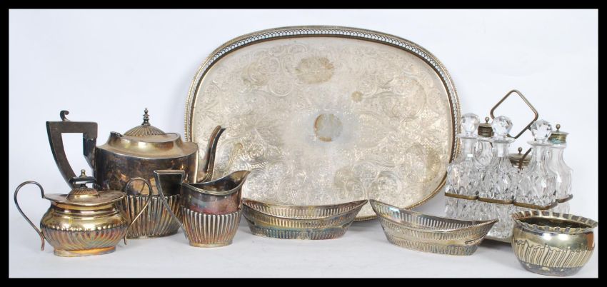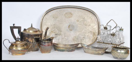 A good group of vintage silver plate items to include, a pair of decorative boon boon dishes having pierced decraition. A cruet set havin cut glass condiments, part tea service with makers mark to base being Walker and hall, plated tray and bowl. Highest measures 23 cm.