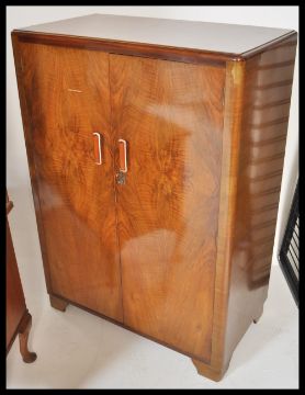 An early 20th Century 1930's Art Deco walnut bedroom suite consisting of a double wardrobe having a stunning starburst finish to the twin doors, tallboy, dressing chestall fitted with period bakelite handle and raised on cabriole legs.
