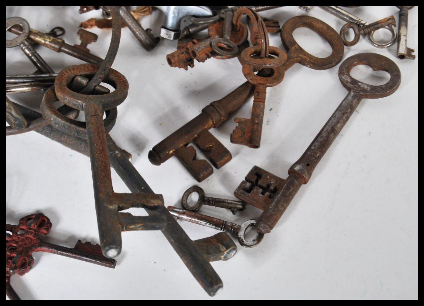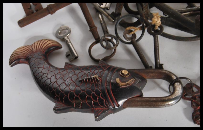 A collection of decorative antique keys of various sized and forms along with a pad lock in the form of a fish white red enamelled and gilt detailing. Longest measures 16cm.