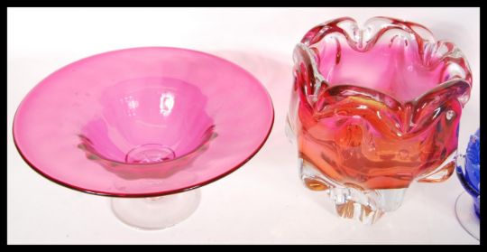 A group of vintage retro 20th Century studio art glass to include a pair of Murano end of day blue glass vases, Murano Sommerso cranberry glass molar type vase and a signed Bristol blue cranberry glass bowl. Tallest measures 23cm high.