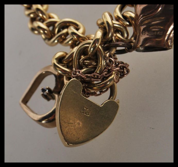 A 9ct gold hallmarked charm bracelet being adorned with boot, heart padlock and heart with diamond. Total weight 19.2g