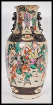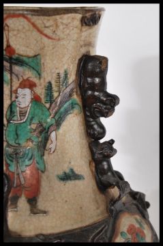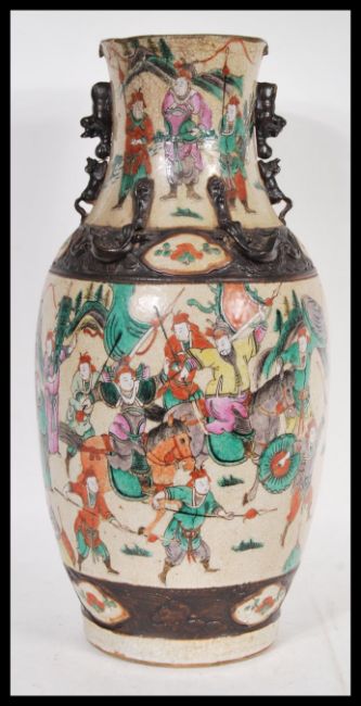 A 19th Century Chinese large base having a crackle glaze ground with hand painted famille verte decoration depicting warriors fighting and on horseback. Brown incised decorated border and four character marks to base.