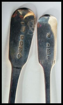 A group of hallmarked silver flatware dating from the early 19th Century to include Robert Williams Exeter 1835 spoon, Victorian teaspoon, George Turner London 1914, silver hallmarked fork and a silver hallmarked salt spoon, Weighs 95.7 grams. Longest measures 16 cm.