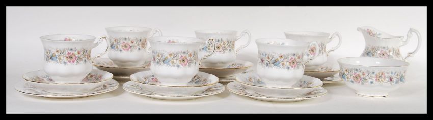 A 20th Century Paragon fine English bone china tea service in the Meadow Vale pattern consisting of six cup saucer side plate trios, sugar bowl and creamer jug. Stamped to bases. Measures 8cm high x 8.5cm diameter (cups).