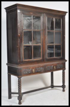 A good Victorian Jacobean commonwealth revival oak bookcase on stand. Raised on bobbin turned supports with twin drawers to the stands frieze having carved geometric decoration. Above, a two good glass bookcase cabinet with carved dentil and flared cornice. Dismantles into 2 pieces for ease of movement. Measures: 176cm high x 125cm wide x 44cm deep.