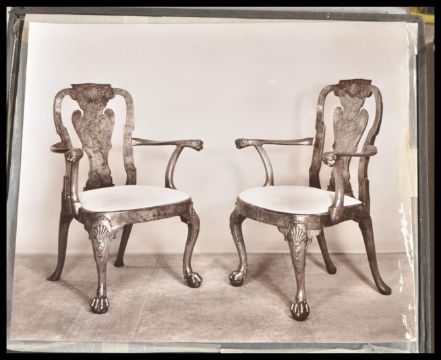 A large collection of glass negatives by still life photographer Raymond Fortt from the archive of Raymond Fortt photographic studios taken between 1950 - 1970. Comes with a collection of very large glass plate negatives (25x32cm) some including the corresponding same sized bromide prints being stamped to reverse. All are supplies in six original ilford glass plated boxes. These negatives feature pictures of late 19th Century and early 20th Century furniture, fine art paintings, clocks, statues etc that wew from antiques dealers Biggs of Maidenhead. These images were used in catalogues and adverts in magazines (some included) along with other information regarding Raymond Fortt.