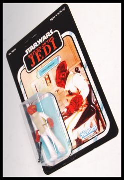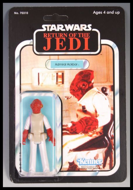 A vintage Kenner made Star Wars Return Of The Jedi ' Admiral Ackbar ' action figure, mounted on a REPRODUCTION card back. With weapon.