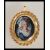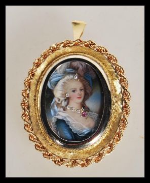 An 18ct gold / 750 marked portrait necklace pendant. The portrait miniature with inset diamonds and ruby to the ladies necklace. Pendant measures 4cms x 3.5cms. Total weight 13.7g. Measures 4.5cm long.