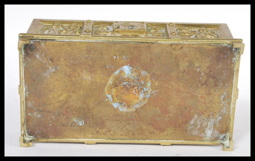A late 19th Century French Gothic Revival heavy brass or bronze ecclesiastical box having relief decoration depicting Medieval scenes in Gothic archways. The box with hinged lid raised on bracket feet. Measures 7cm high x 14.5cm width x 8cm deep.