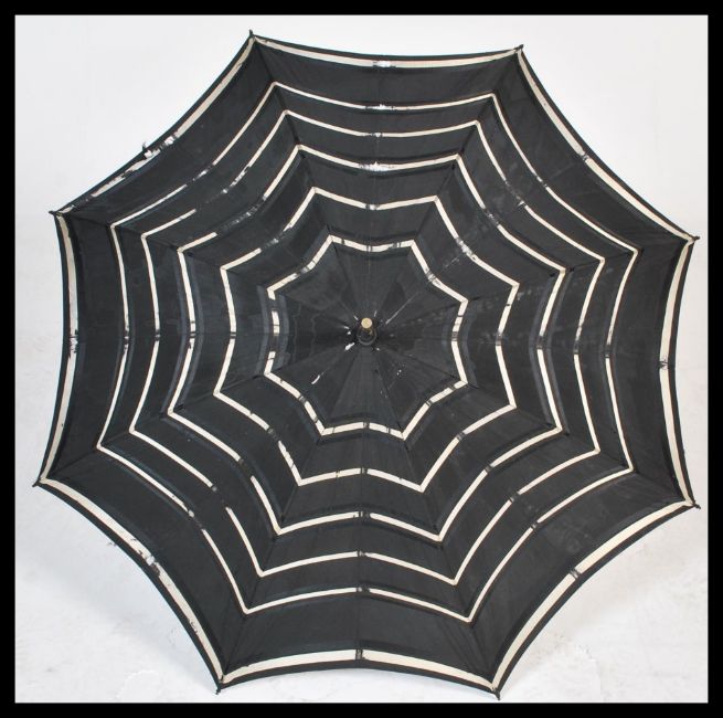 An early 20th Century Edwardian silk parasol with an ebonised carved handle the silk with geometric pattern. 91cm long.