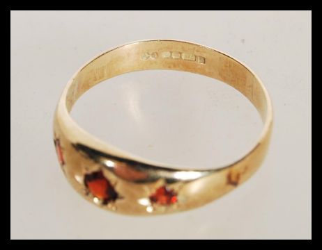A hallmarked 9ct gold three stone garnet ring having three flush set faceted red stones. Weighs 2.2 grams size Q.
