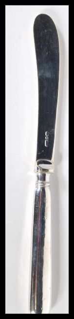 A set of six 20th Century hallmarked silver knives complete in fitted faux black leather case. Knives measure 17 cm long.