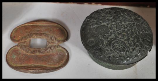 A collection of items to include a Chinese wooden bowl with inset monetary token inset into the base flanked by mother of pearl decoration, a Japanese lacquered brush bot decorated carp in relief to base, a framed bronze Chinese token etc.  31cm high tallest.