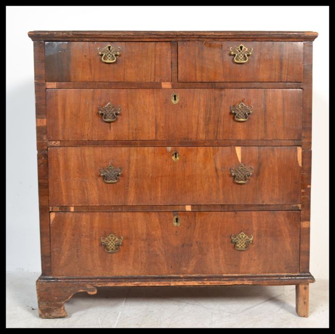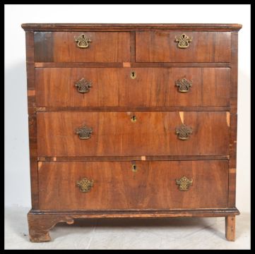 A 17th century walnut Queen Anne 2 part chest of drawers. The chest with pierced brass  handles and escutcheons having bracket feet with flared top over the bank of short and deep drawers. Measures: 101cm high x 98cm wide x 52cm deep.