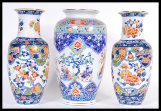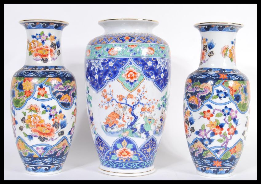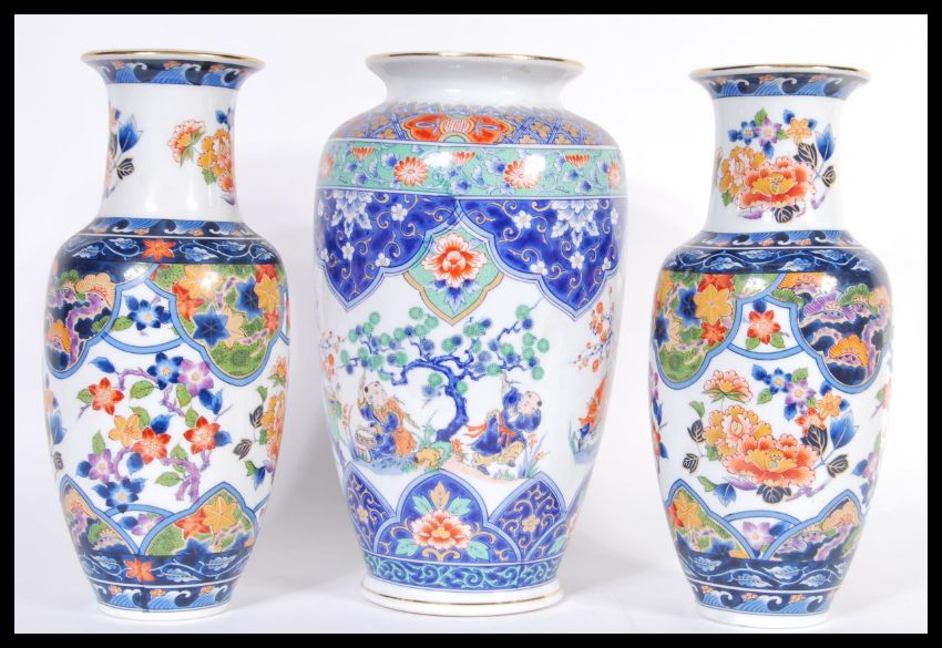 A 20th Century Chinese bulbous vase decorated with musicians and peonies throughout together with a pair of matching Chinese garnature vases. Tallest measures 27cm high.