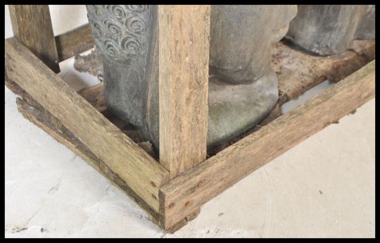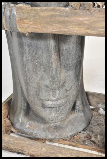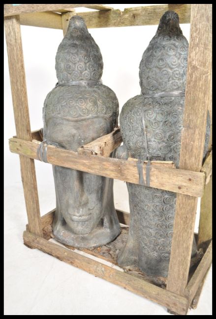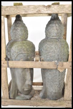 Two 20th Century terracotta Asian deity / buddha sculptural heads of large proportions being set within an industrial work wood crate.