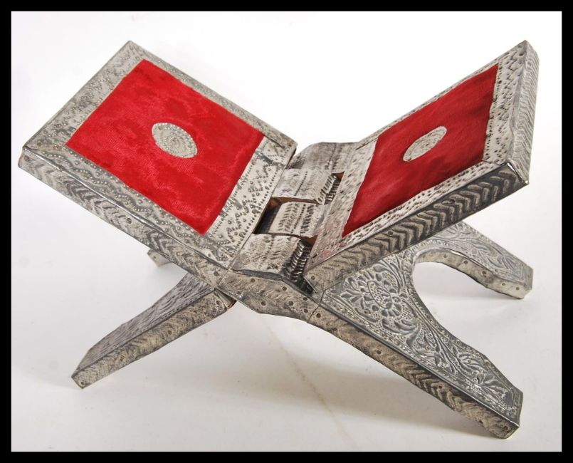 Two items of silver white metal Islamic wear to include a folding metamorphic Quran stand and a white metal easel with engraved designs and calligraphy. Tallest measures 30cm high.