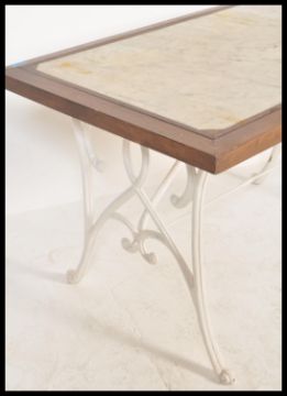 A vintage 20th Century garden table, cast iron base surmounted with a heavy framed marble top. Measures 67 cm high x 112 cm wide x 69 cm deep.