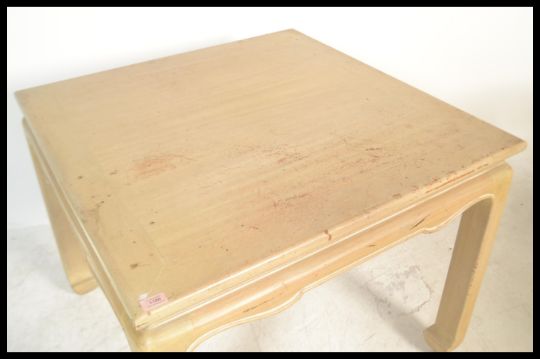 A 20th Century Qing Dynasty style painted Chinese square hardwood centre ( dining )  table, the carved aprons with scroll ornament and on square supports. Measures 74cm high x 91cm wide x 91cm deep.